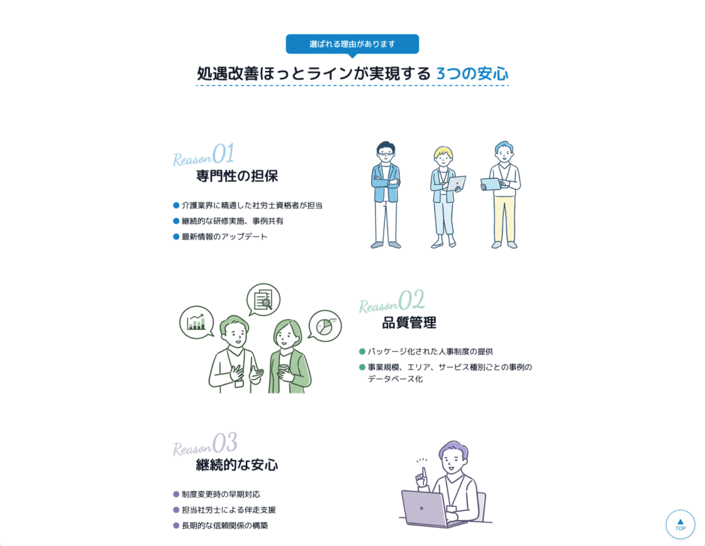 介護事業所向けに「処遇改善加算」や人事制度の運用をサポートする社会保険労務士法人のサービスサイトです。