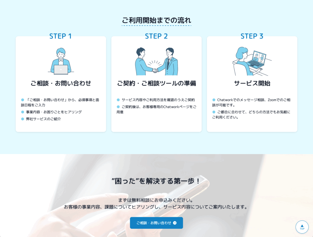 ファーストビューからサービス内容・利用の流れまで、CTAを要所に配置し行動を促す導線を構築しました。